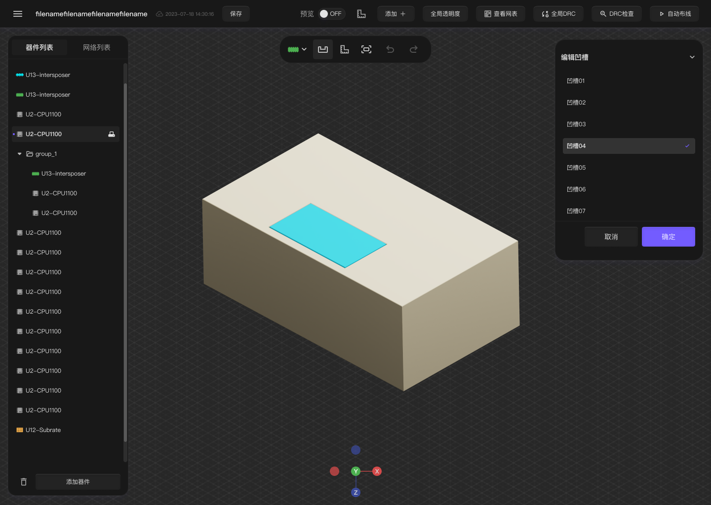 通过以上交互流程的设计,我们确保了用户在操作器件下嵌和恢复凹槽时的便捷性和准确性。用户可以根据器件的叠层高度自动吸附,同时在恢复凹槽时能够清晰地看到可恢复的凹槽列表,从而做出明智的选择。
